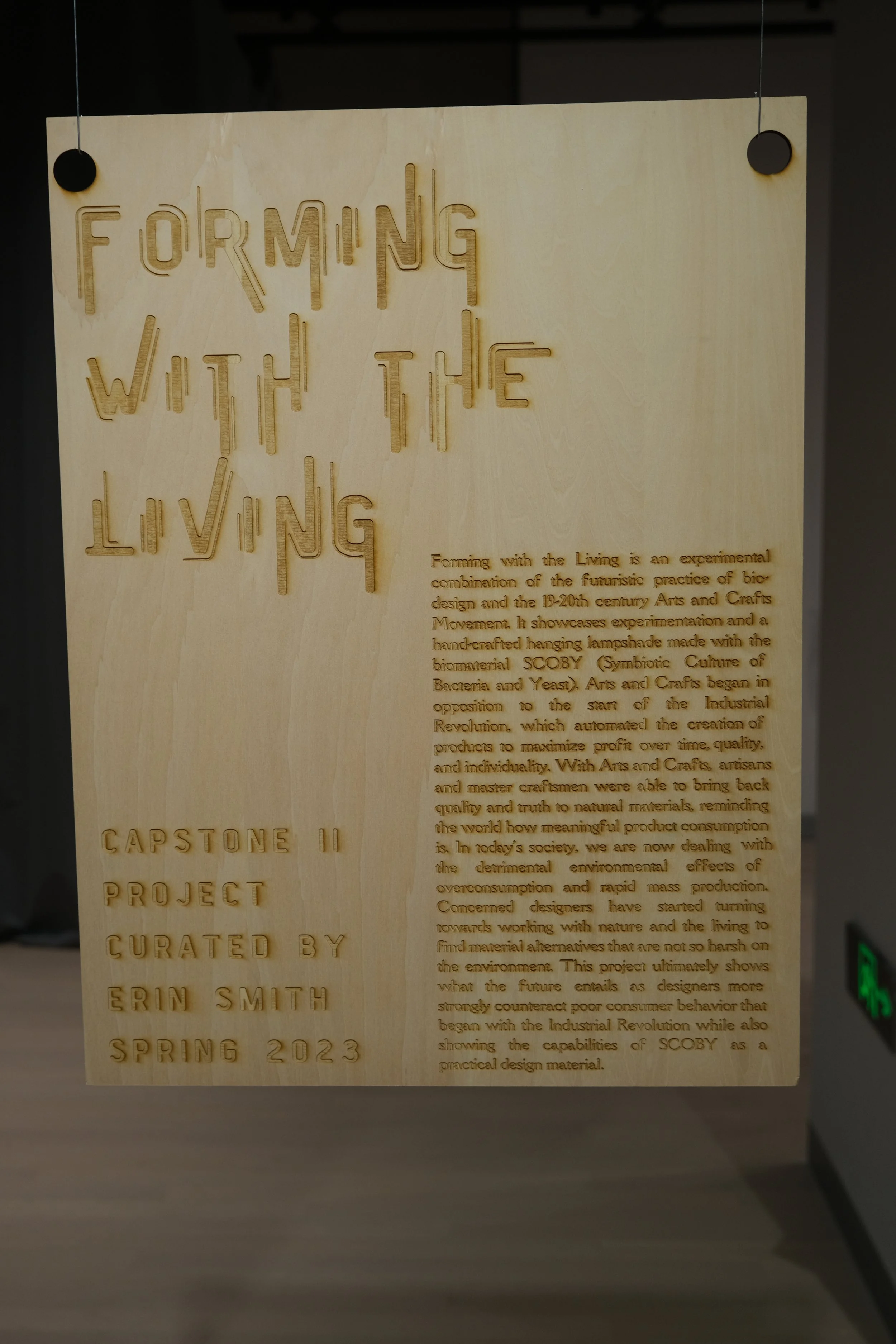 “Forming with the Living” is a combination of the futuristic practice of bio-design and the 19-20th century Arts and Crafts Movement, showcased through experimenting with SCOBY (symbiotic culture of bacteria yeast) as a material with Arts and Crafts design characteristics. The display boasts a sensory experience composed of sight, touch, and smell to foster a deep connection to the SCOBY beyond solely seeing it as the material in a final product.